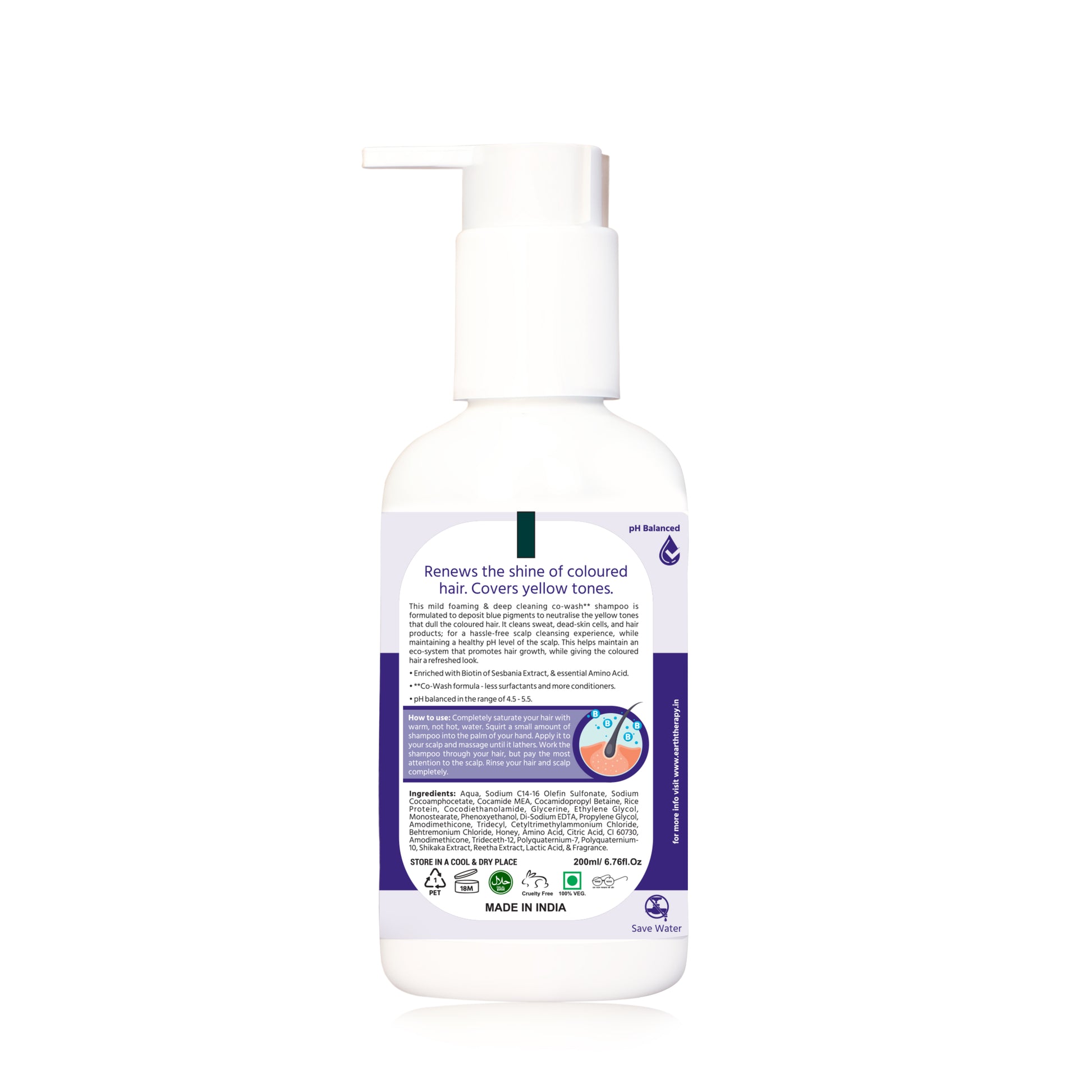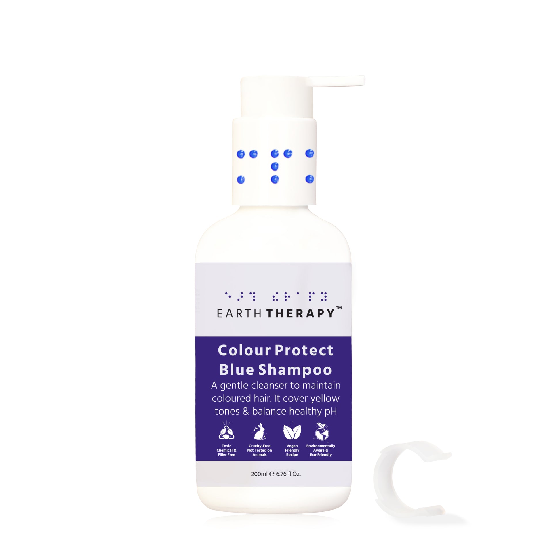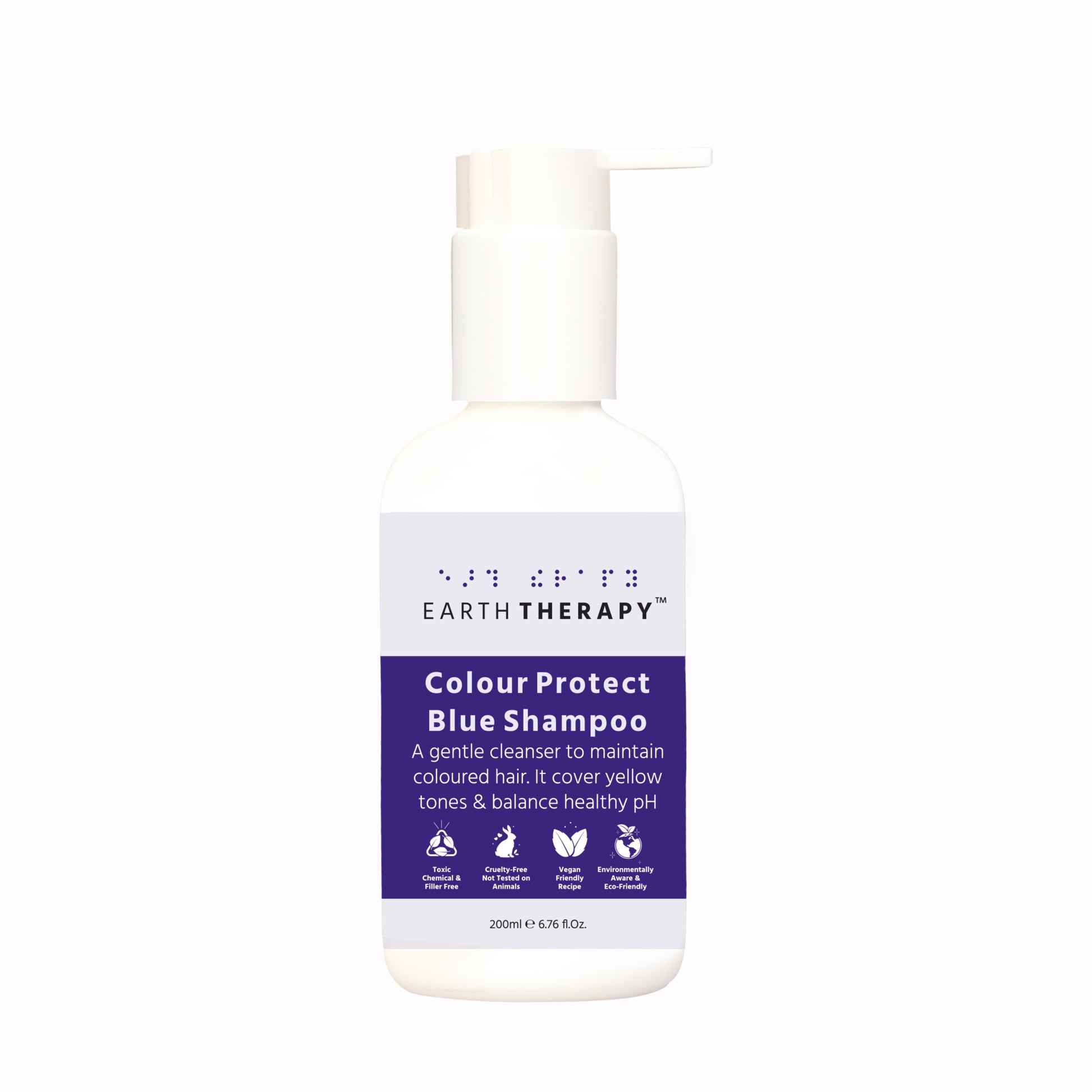 This is the Colour Protect Blue Shampoo by Earth Therapy. It is a gentle cleanser specifically designed to maintain coloured hair, effectively cover yellow tones, and balance a healthy pH for vibrant, healthy-looking hair.